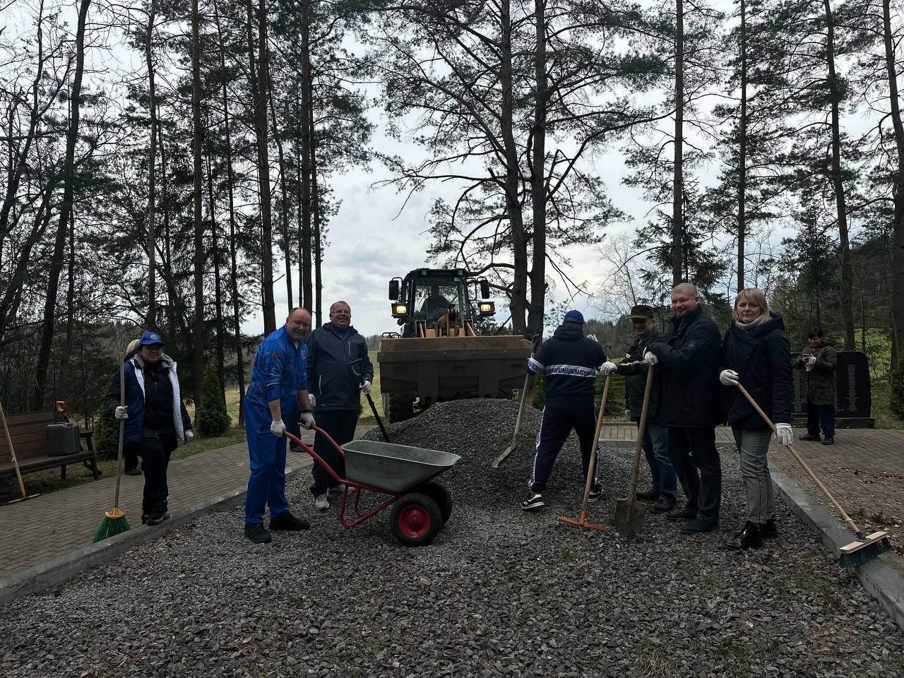 Накануне республиканского субботника работники строительной отрасли вместе с профсоюзным активом Минской городской организации Белорусского профессионального союза работников строительства и промышленности строительных материалов сделали важное, святое дело во главе с заместителем председателя Андреем Шинкевичем. Целью поездки стало благоустройство и почтение памяти на месте, где в годы Великой Отечественной войны произошла одна из самых страшных трагедий Логойщины.